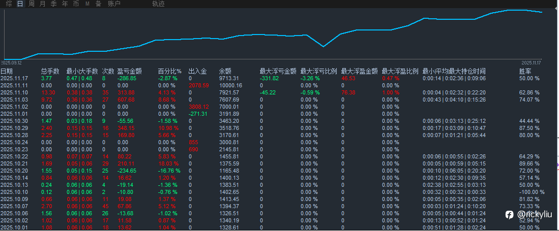 11月3号入金,到今天一周时间! 这个账户是自己艰难的一步,是自己下定决心改变自己的最后一次交易! 这周3,4,交易有点变形了,因为老毛病,因为心态问题,导致害怕亏损和利润回吐。从轻仓到加仓,到重仓止损。 最后一次,绝对不让自己爆仓,如果这个账户爆仓了,自己也就不适合交易了。 虽然自己对自己技术,对自己的系统有信心,但是没有执行纪律,又有什么用呢!没用的! 虽然这周是赚钱的,但是好痛苦,因为自己不争气,心魔一直在作祟,自己还压不下去。让自己预见如果压不下去心魔,长期交易下去,准确率下降的同时,肯定有一波行情会让我一直止损,到最后自暴自弃爆仓!所以,一定要加油,改变自己!