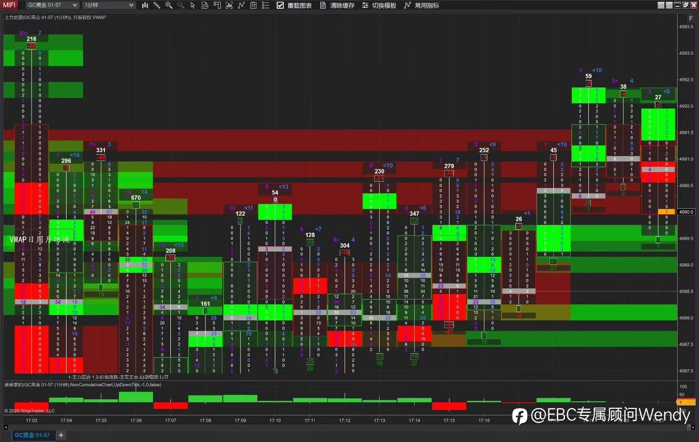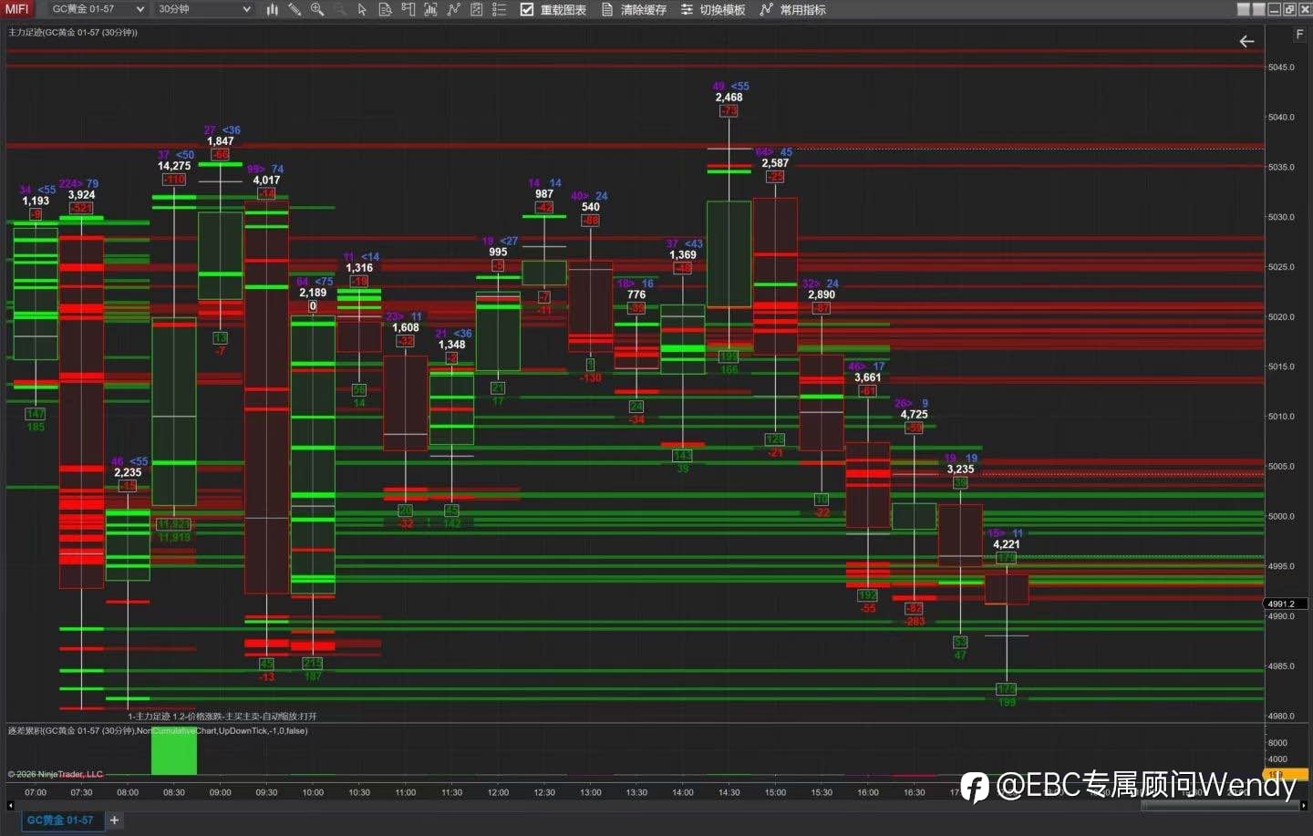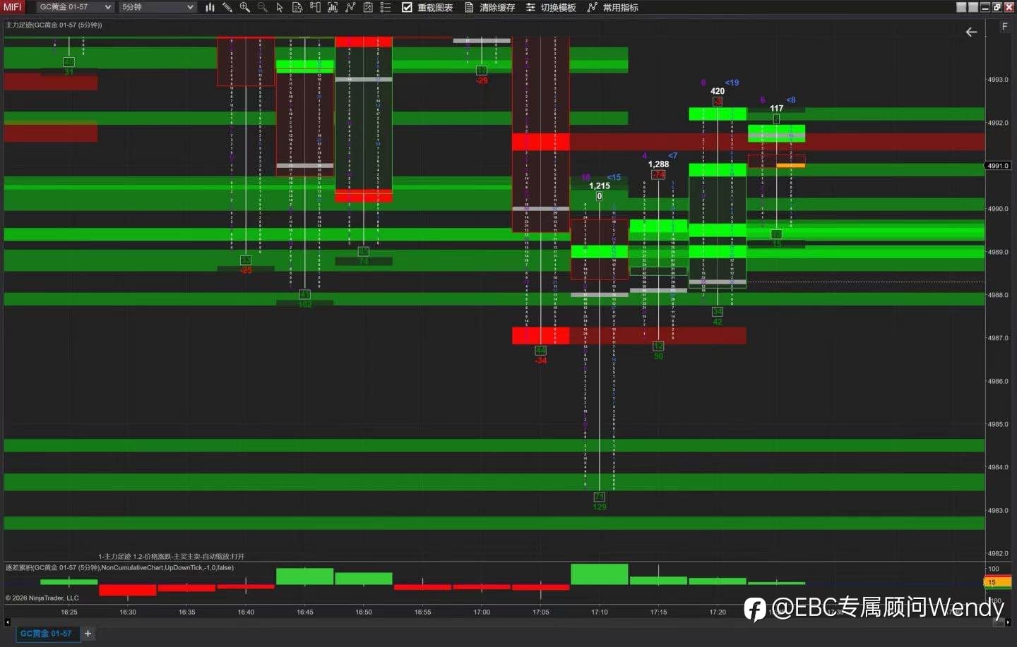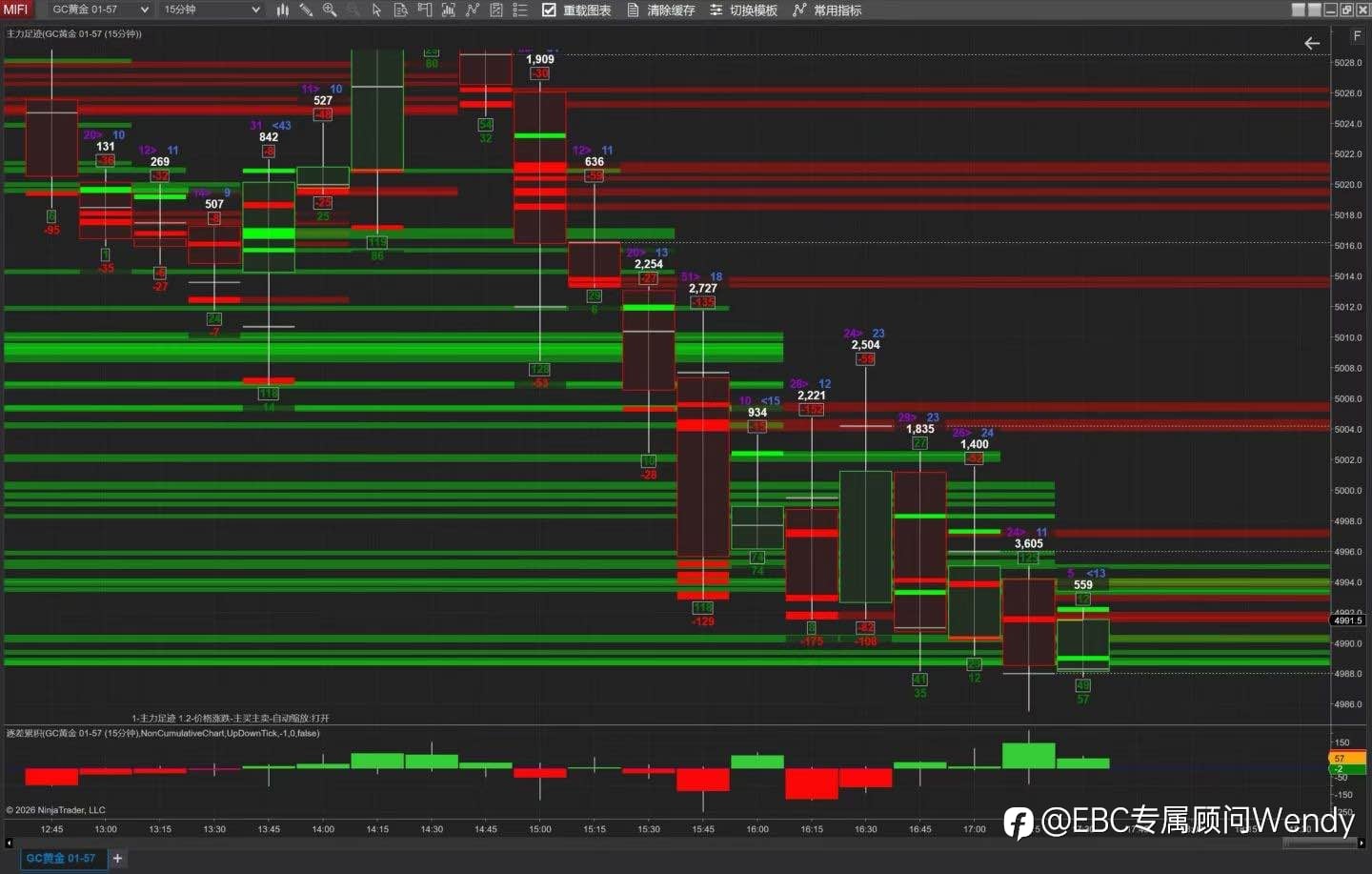 足迹图(four punch chart)是基于Tick数据的订单流分析工具,本期内容主要介绍足迹图的基本概念与应用方法,重点讲解其核心构成元素包括主动买方成交量(ask volume)和主动卖方成交量(bid volume),以及Delta值的计算与市场含义。通过观察关键支撑位与阻力位上的订单流行为,结合Delta变化,可辅助判断价格反转信号。同时建议将足迹图与其他指标如未平仓合约量(open interest)和累计成交量Delta(CVD)结合使用以提高分析准确性。 一、足迹图基础概念 足迹图是一种基于订单流的数据分析工具,能在K线内展示每个价位的买卖成交量细节,相较于普通K线,能揭示微