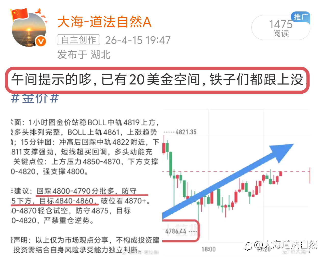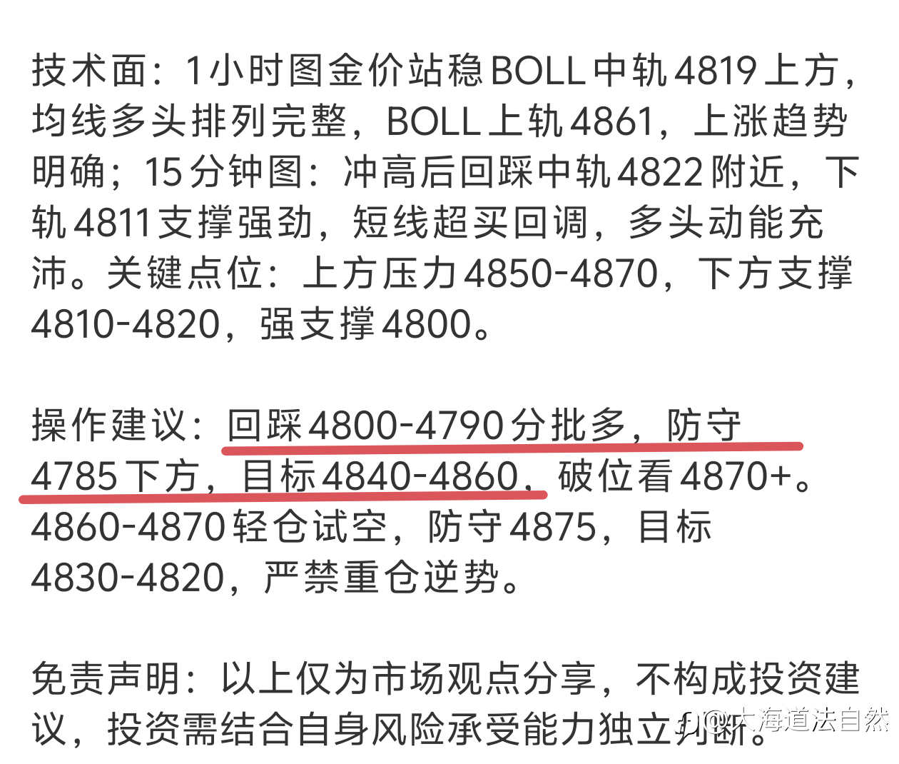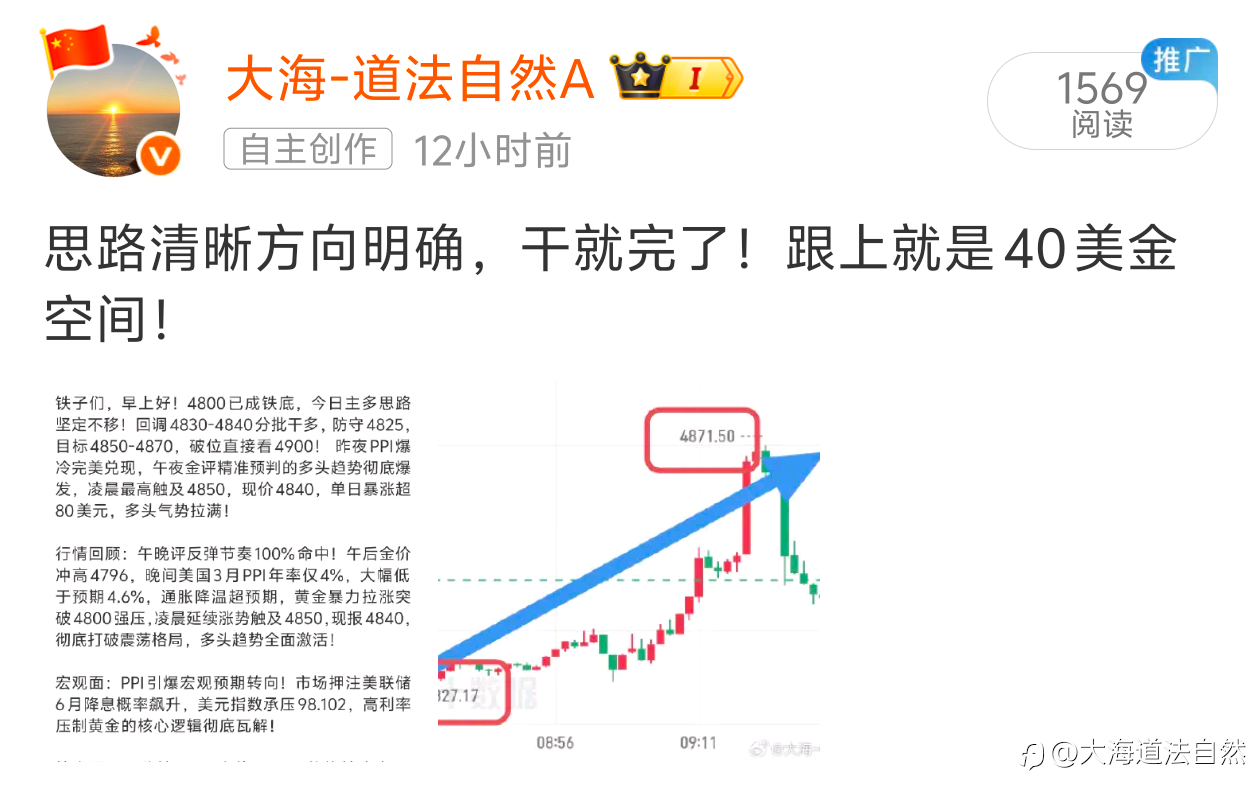 大海:4.15黄金午评 | 早盘多单狂赚40点!冲高回落只是洗盘,回踩继续干多! 铁子们午安!早盘行情把早评的预判焊死在铁板上!PPI史诗级利多的多头余威直接把金价推上4871的阶段新高,早评4830-4840进场的多单,最高狂揽超40点利润!午盘多头获利了结引发短线回调,现价4813,回踩4810-4820支撑区间,大趋势多头格局丝毫未变,回踩就是送钱的低多机会! 行情回顾:早盘金价延续昨夜PPI爆冷的暴涨势头,开盘后稳步上攻,午间触及4871高点,随后多头获利了结引发快速回落,最低下探4811,现报4813,全程牢牢守住4800铁底支撑,多头趋势未被