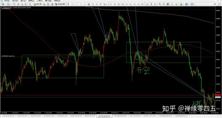 减仓位置示意市场很给面子,真的走出了一分钟盘整走势类型下了,而且破了前边一分钟上的低点,向下冲的力量比较强,但是这里依然是在五分钟震荡中,当下的位置出现了一分钟的一笔上,随后一笔下,在一笔下的底分型处,减掉一半仓位,盈利3.5美刀左右。另一半的仓位哪怕扫损会损失4.5美刀左右,整体的这一个单子亏损也就1美刀。如果这里延续五分钟下跌,这个0.01没减的底仓就保住了,未来带给你的就是一部分较大的盈利空间。目前一分钟线段上出现了,也就是说这个一分钟盘整下跌的结束特征出现了,等待一笔下,不破新低,可以尝试一个对冲多单,把这剩余的0.01手的利润对锁起来,等待向上的演变。这个就是天地锁的另一种用法了,往