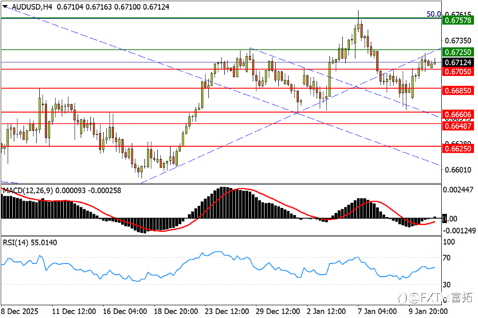 NO.1 澳元/美元(AUD/USD) –回升冲击下轨、右肩,打响返涨关键战 日线图看,美元在今夜重磅CPI数据发布前停止反弹脚步,而澳/美即时表现或成美元是否返弱的重要参考。汇价隔夜中阳收复去年9月高点0.6705,但上方面临去年11月下旬起涨势下轨和去年高点0.6725两大技术阻力。一并站上无疑有助澳元重启升势,上行将重新剑指上周高点(接近2020-21年涨势的50%回撤位0.6757),冲破后即将惯性挑战24年7月高点0.6800。指标方面,MACD持续于零轴上方横向纠缠;RSI固守强势区震荡,汇价整体强势姿态未改。 4小时图看,澳/美短期形态有勾画小型头肩顶的迹象,上述下轨和0.672