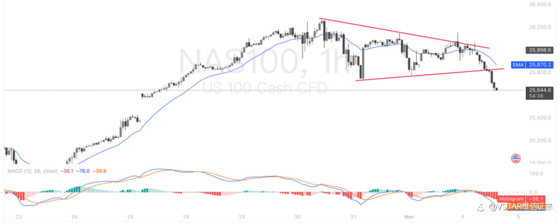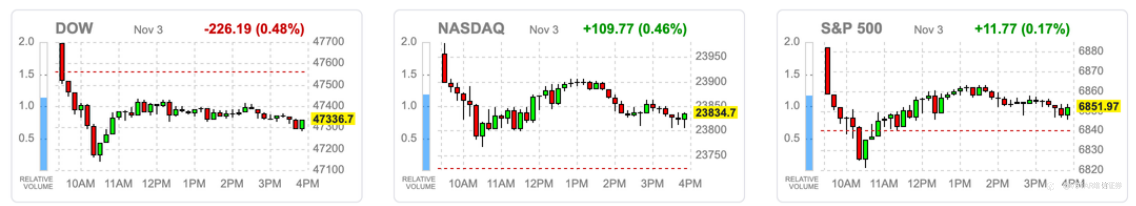 大盘回顾 亚马逊与OpenAI签380亿美元合作协议,AI热潮再点燃美股 美国经济数据显示增长动能持续放缓,ISM制造业PMI降至48.7,低于预期,反映企业在投资与招聘上更趋谨慎。美联储官员发表鹰派言论一度压制市场情绪,但亚马逊(AMZN)与OpenAI签署高达380亿美元的长期合作协议,AWS将在未来七年为OpenAI提供数十万颗英伟达(NVDA)GPU,加速其从研究型机构转向商业化AI巨头,激发大型科技股买盘。 虽然美联储内部对12月政策意见分歧,市场早盘一度震荡,但因ISM价格指数下降、企业财报普遍优于预期,以及11月历来为美股强势月份,资金随即回流。板块方面,非必需消费类股领涨,亚马