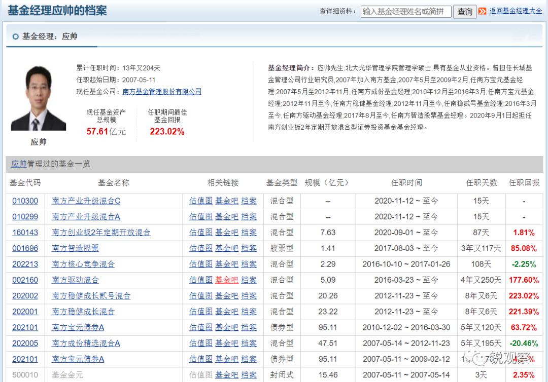 和财富君一样,估计很多人,年末都遇到了类似困惑: 市场风格能否转换? 成长股真的估值过高? 周期股能“顺”多久? 医药股还要调整? 新能源板块持续强势? …… 对于这些问题,财富君这次介绍的嘉宾,具有较强的个人投资风格属性: 北大硕士毕业,19年公募从业经验,13年基金经理生涯,擅长成长股研究,强项是精选个股,尤其是对成长“三剑客”具有独到见解,任职最佳回报超过200%…… 今天的嘉宾,就是基金经理应帅,他是南方基金旗下的一位公募老将。 (1)应帅 说起应帅,很多人的第一反应,他是一位公募老将。 其实,从他的履历,就能得到证明。官网资料显示,从北大光华管理学院硕士毕业以后,应帅进入基金行业,2
