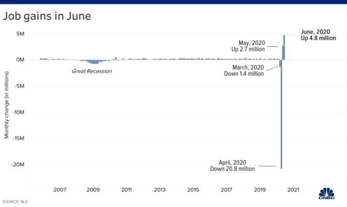 美国6月非农增加480万人远超预期 失业率连续第二个月回落