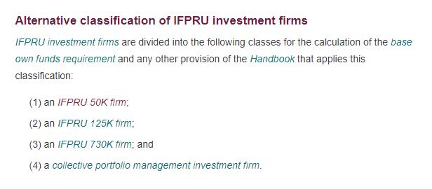 在FCA的手册中,会把投资公司进行一个基础分类,主要是基于保证金的:50k license、125k license 和 730k license,对应我们的外汇保证金行业则是投资顾问牌照;Matched Principle License(STP)牌照和