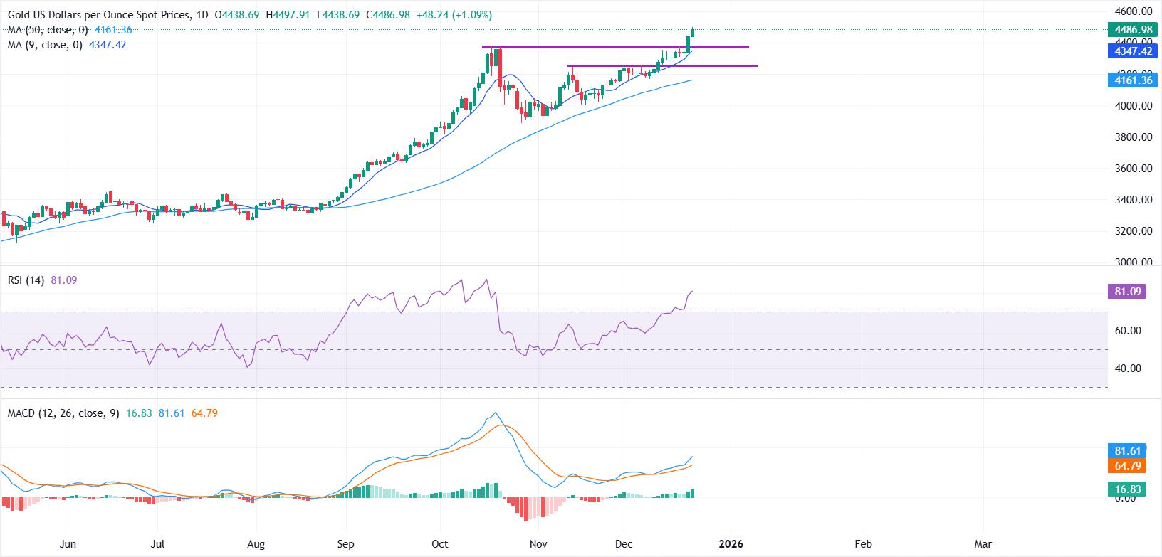 Emas melanjutkan rally-nya ke wilayah yang belum terpetakan, didukung oleh meningkatnya risiko geopolitik.Dolar AS yang lebih lemah dan ekspektasi pelonggaran lebih lanjut dari Fed hingga 2026 memberikan pendorong tambahan.Dari segi teknis, XAU/USD tetap dalam tren naik yang kuat di atas moving aver