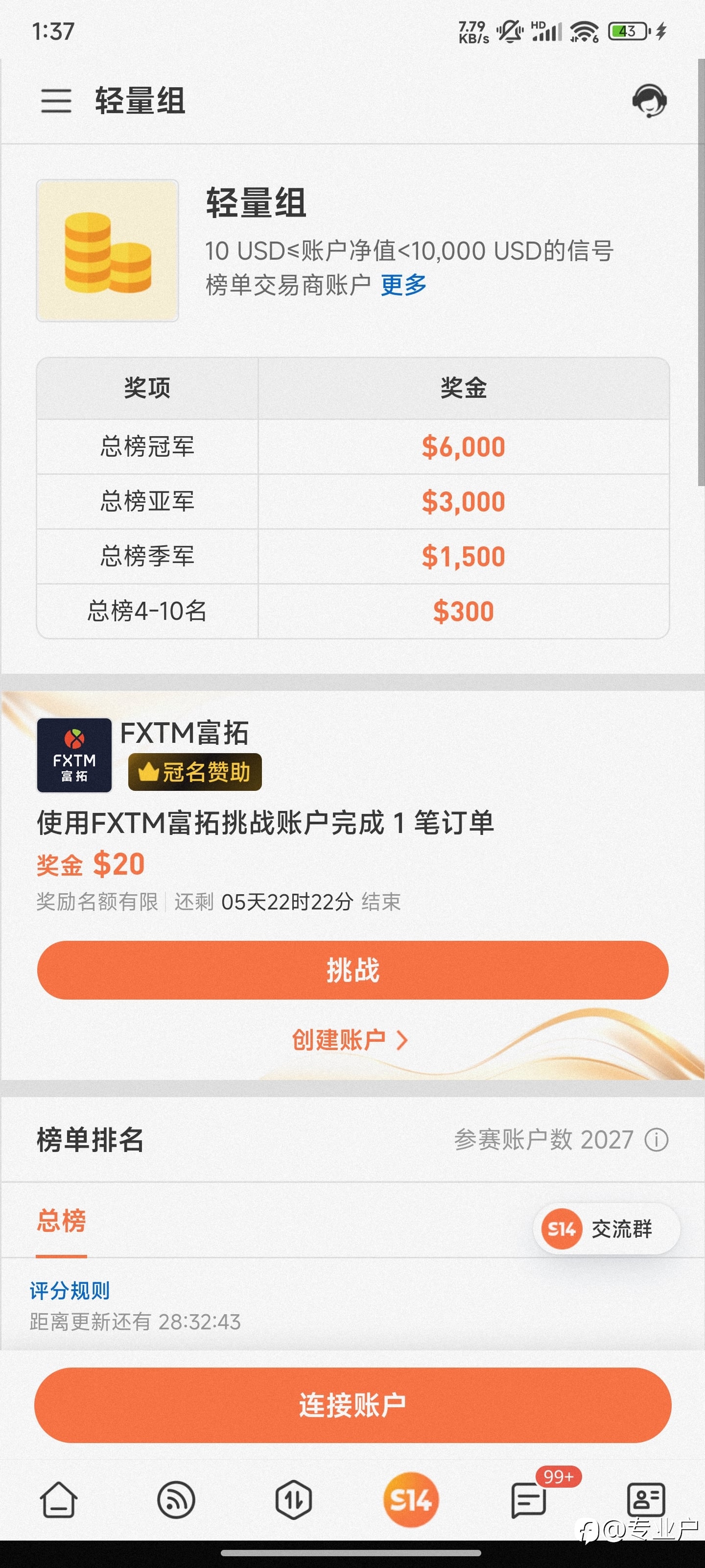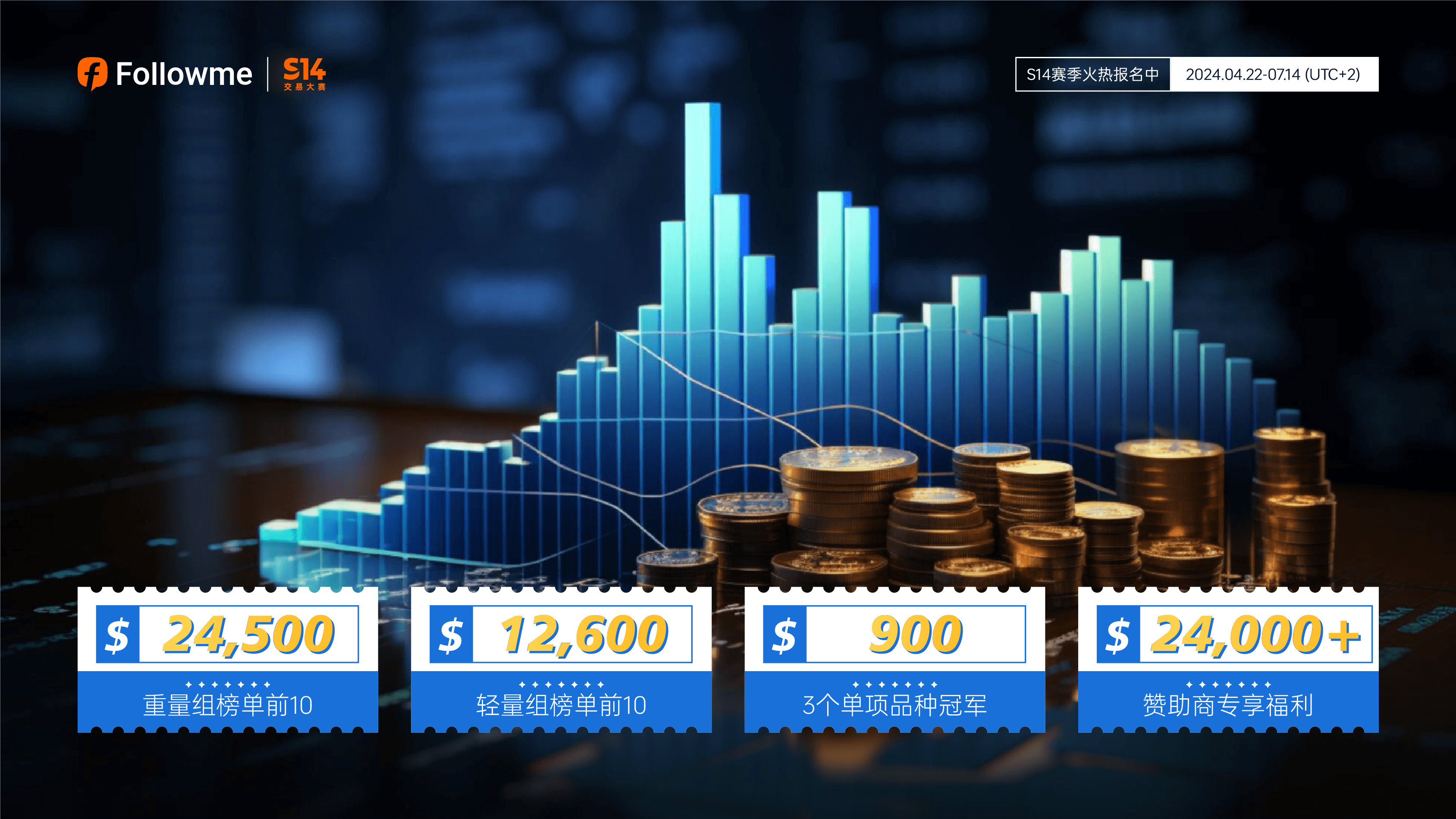账户报名参赛并随之达成 14 笔订单,现已触发现金抽奖券 1 张。 1 个工作日内你将收到 FOLLOWME 交易大赛发送的抽奖口令,届时请凭口令扫码抽奖