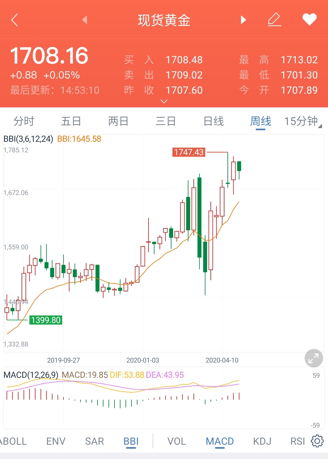 2020.4.29 黄金周线分析 1693-1720收敛 操作:空仓 节后在看