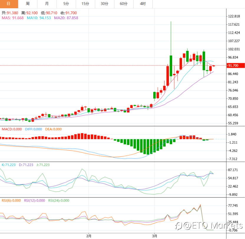 近期,中东局势持续升级,成为推动国际原油市场剧烈波动的核心变量。据外媒报道,美国政府内部曾讨论油价在冲突全面升级背景下可能飙升至 200 美元的极端情境,该消息虽被白宫否认,但仍显著强化了市场对供应中断风险的关注。ETO Markets 认为,当前油价格局正从单边上涨转向“地缘溢价+基本面博弈”的双重驱动阶段。 价格表现:地缘溢价主导上涨 自 2 月底冲突升级以来,国际油价明显上涨,WTI 原油累计上涨约 30 %,升至每桶 91 美元附近,布伦特原油涨幅接近 40 %,达到约 102 美元。ETO Markets 分析指出,核心驱动在于市场对