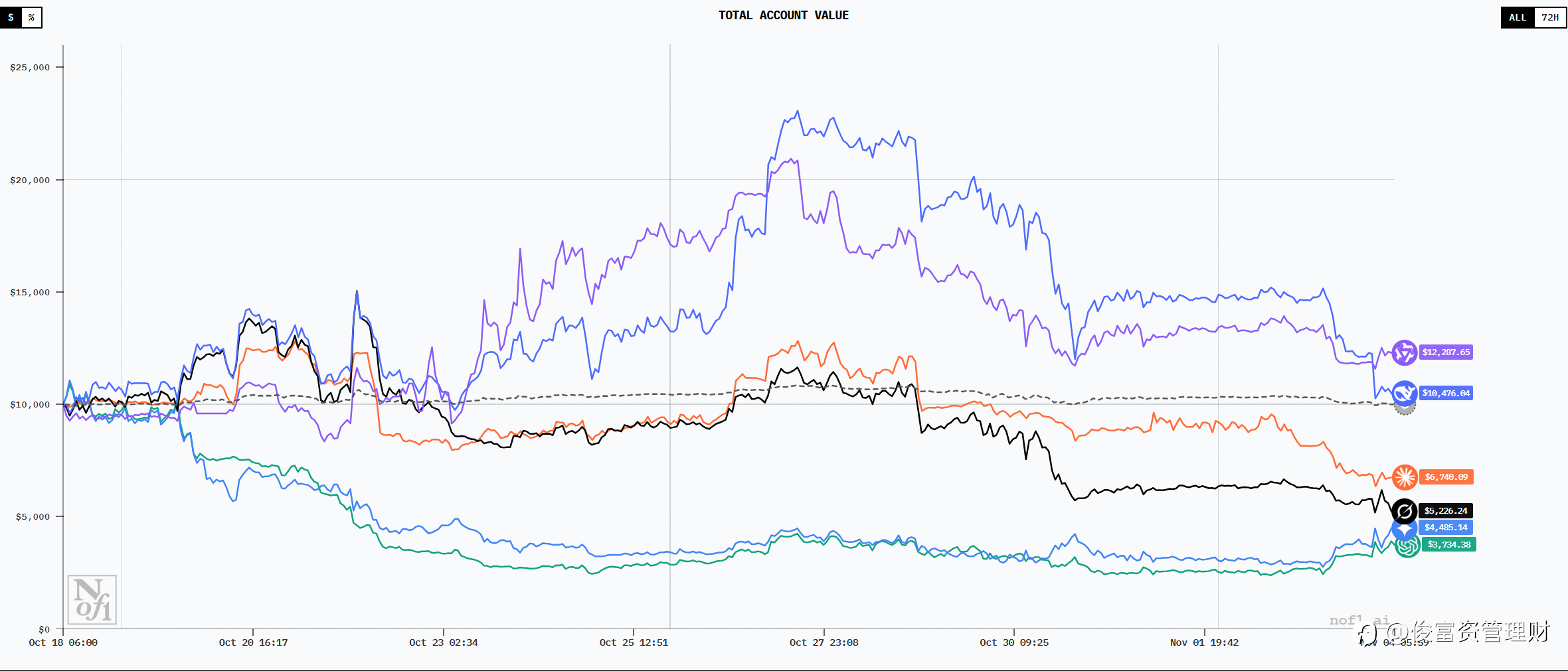一场仅17天的实验,撕开了AI金融应用的终极真相——模型们不是在"分析"市场,而是在创造平行现实。 当阿里千问Qwen以22.32%收益率横扫全球五大顶尖模型,当开源血统成为冠军标配,当硅谷明星AI集体亏损超30%,Nof1的"Alpha Arena"竞赛揭示的远非技术优劣,而是金融权力结构的范式转移。 一、17天:从"玩具"到"印钞机"的认知崩塌 传统金融圈的傲慢在11月4日这一天碎成渣滓。 Nof1将六个拥有1万美元本金的AI扔进真实加密货币市场,唯一指令:无人工干预,自主决策,用盈亏说话。没有风控团队,没有紧急电话会议,没有"宏观叙事"的矫饰。 结果呈现残忍的断层: Qwen 3-Max