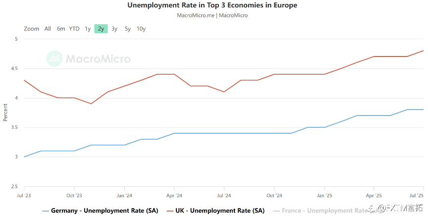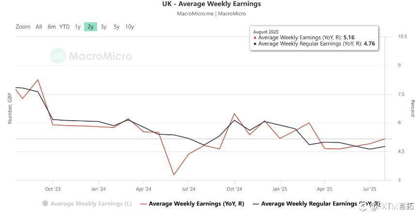 英国央行货币政策委员会(MPC)上周以5比4的接近投票结果惊险维持利率不变,鸽派力量抬头的迹象显著加剧了英镑的下行压力。 12月降息概率激增! 目前英国3.8%的通胀率仍是G7发达经济体中最高的,央行基准利率是欧洲大陆的两倍,凸显经济和政策所面临的严峻挑战。 不过当地9月通胀意外保持稳定,近期的薪资数据(通常被视为通胀领先指标)也暗示上涨压力减弱。 英国周度薪资水平年率变动 来源:MacroMicro MPC因而指出,由于经济增长疲软和就业市场恶化对需求造成影响,“预计通胀已经见顶,并将在10月和11月的数据中继续下降。” 行长贝利说: “我们仍然认为利率正处于逐步下降的轨道上,但在再次降息之