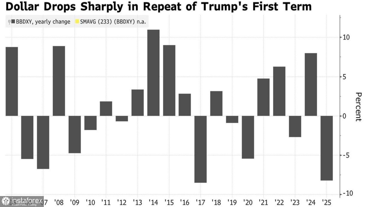 Sejarah berulang kembali. Sama seperti pada tahun 2017, selama tahun pertama kepresidenan Trump, dolar AS melemah terhadap mata uang utama dunia. Investor beroperasi di bawah prinsip "apa yang diinginkan presiden, Tuhan menginginkan," dan menjual "greenback." Pada tahun 2018, dolar AS memasuki tahun