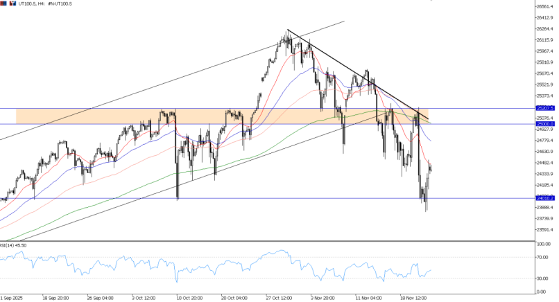 市场开周情绪逆转:12 月降息概率大幅上升 本周市场以情绪的急剧逆转开局,受到美联储官员协调信号的影响,12 月降息的概率大幅上升,扭转了近期的鹰派趋势。 纽约联储主席约翰·威廉姆斯(John Williams)发出了强烈的反向信号,恢复了投资者信心。市场隐含的 12 月降息概率从周五收盘前的约 30% 飙升至约 70%。 这一基本面转折推动风险情绪强劲回升。美元涨势暂停,纳斯达克 100 指数等利率敏感资产重新受到买盘关注。 美联储鸽派倾向 市场目前必须应对美联储内部的明显分歧,鸽派阵营正在强烈抵制鹰派言论。 · 威廉姆斯的影响力:作为永久投票成员,威廉姆斯强调以最大就业目标为优先,并指出当