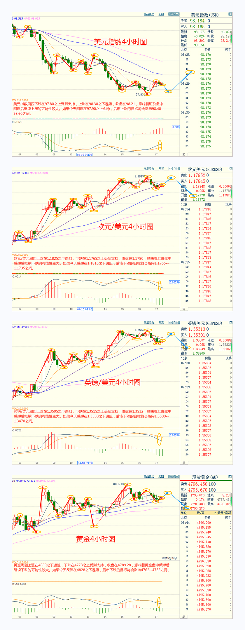 CWG Markets市场资讯2026年4月10日(周五) 汇讯摘要: 周四,在以色列寻求与黎巴嫩和谈,以及海湾地区脆弱的停战协议重燃希望之后,美元指数日内跌幅扩大,最终收跌0.2%,报98.80;基准的10年期美债收益率收报4.2810%,对美联储政策利率敏感的2年期美债收益率收报3.773%。 地缘政治风云变幻,中东停火协议的脆弱性与美国通胀数据的即将公布交织在一起,推动金价在周四(4月9日)反弹约1%。现货黄金一度触及每盎司4801美元,最终收涨1%至4765美元附近。当前黄金市场处于地缘政治风险与宏观经济数据的十字路口。周五美国3月CPI数据的公布,或将成为关键催化剂。 因内