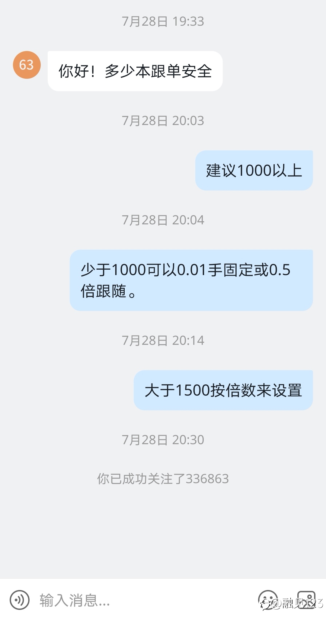 建议所有已跟单或准备跟单的伙伴按照你的本金/策略资金余额倍数来跟单。 另外不要一个账户同时跟单很多人的策略,另外又参杂个人交易。我们都在努力做仓位比例管理以保证一些日常反方向波动在可控范围。但你资金小订阅跟单的人又太多导致仓位过重,一个波动就爆了,就不能实现和主账户盈亏同步。 另外那些期望找到完美策略,实现每天稳定盈利的朋友建议不要做金融交易。你也找不到绝对稳定的跟单策略,一切都是无常,不管是EA还是手工大师。有钱存银行,买国债相对比较保险,收益稳定固定。 金融交易就是在市场波浪起伏里取点浪花而已。而外汇是加了高杠杠放大收益同步放大风险。合适的仓位比就是调整下海的船的大小,让船至少可以驾驭你所