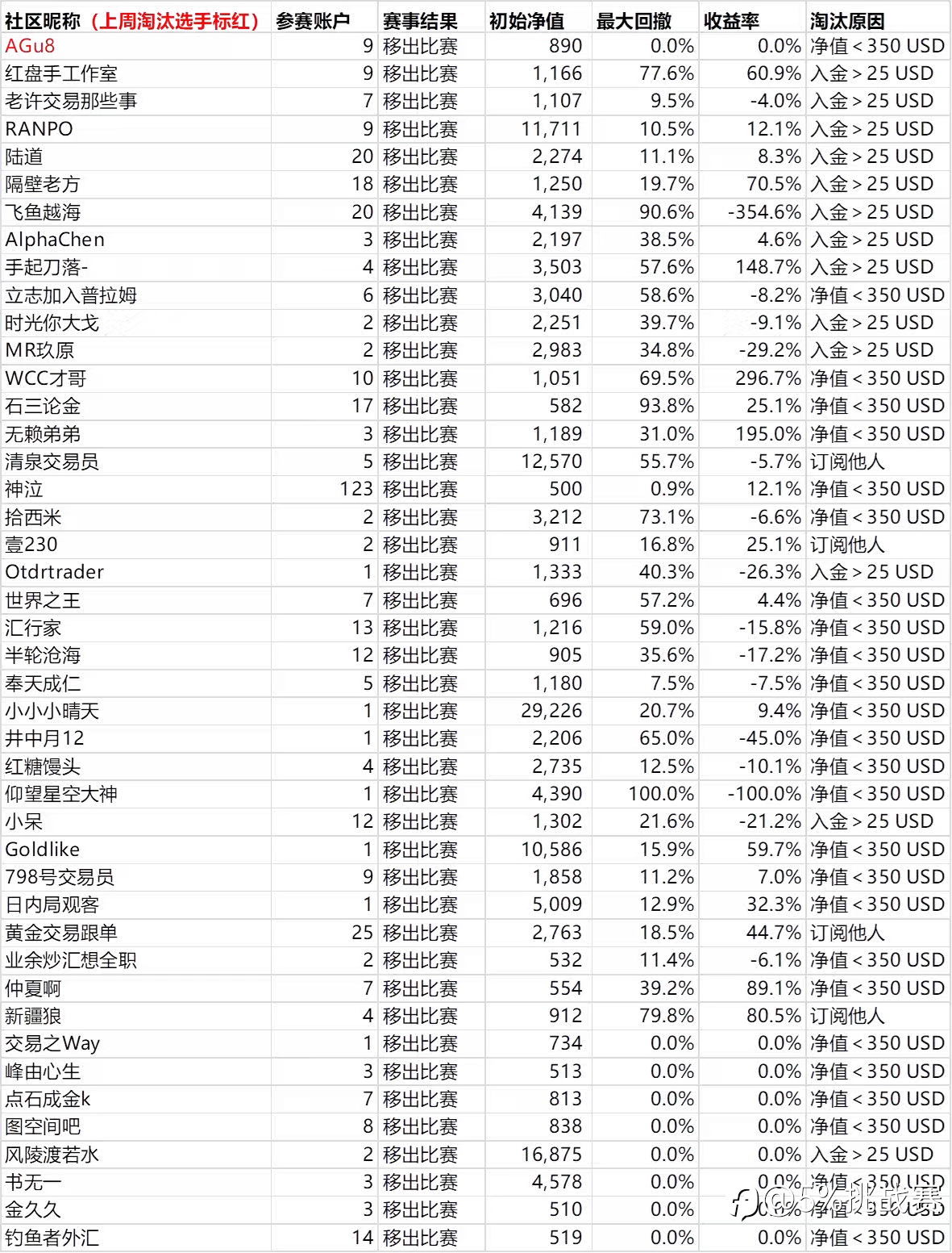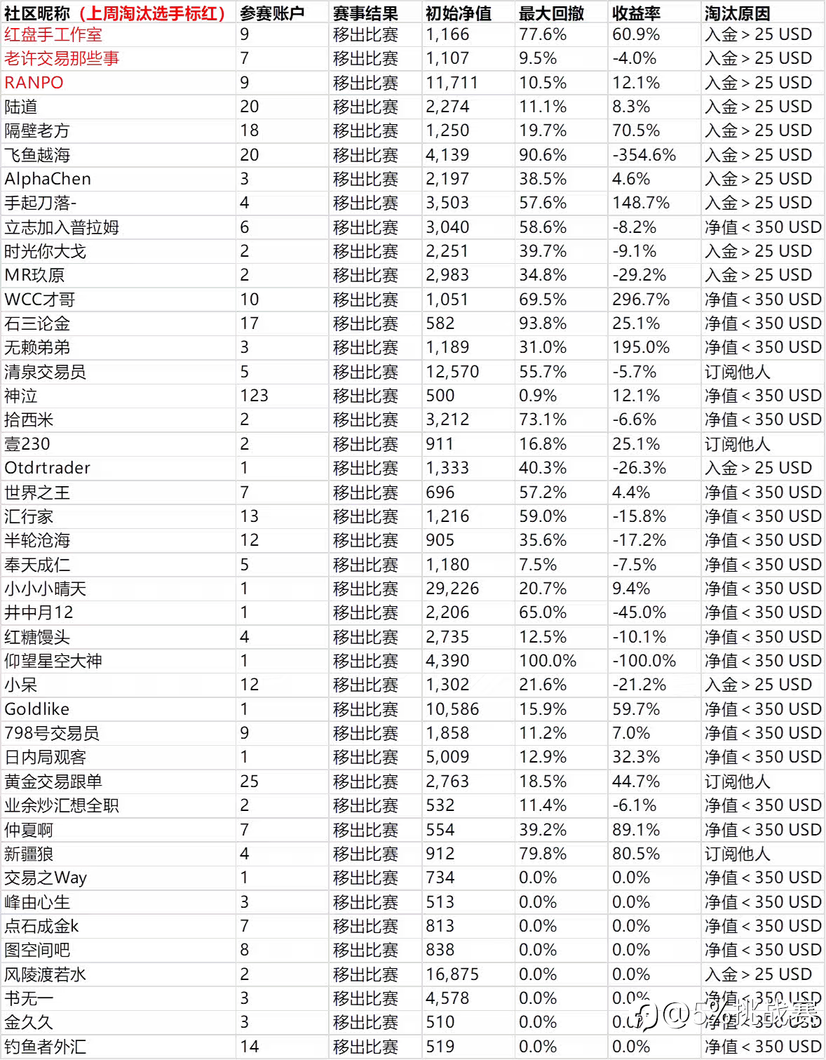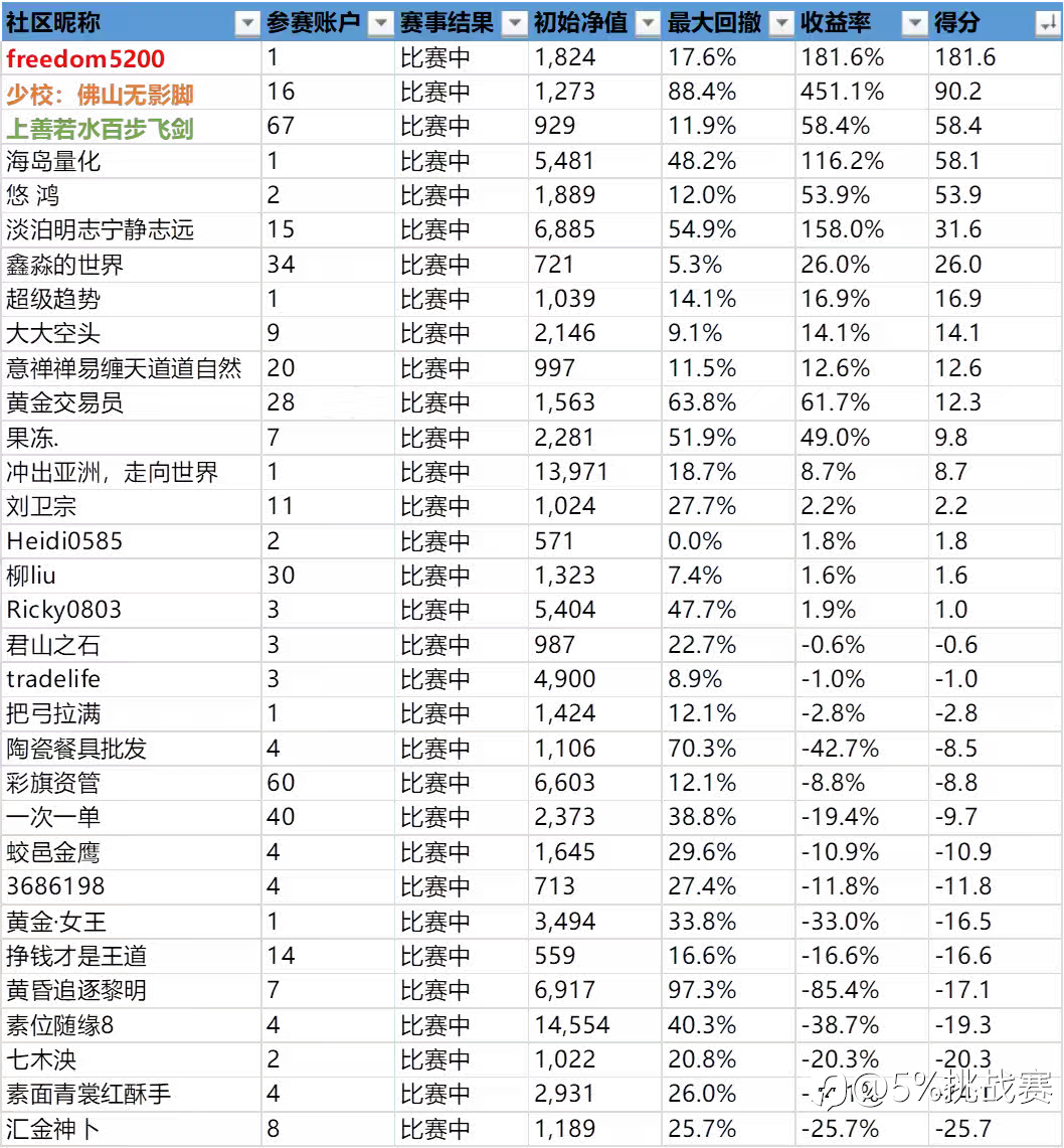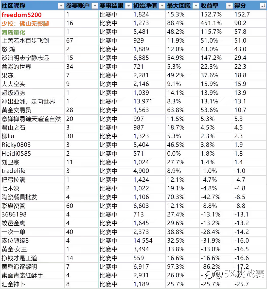 5%挑战赛的宗旨:与优秀交易员同行。 淘汰名单:原因:1、净值低于500美金,2、订阅他人信号,3、入金>25美金 时光荏苒,5%挑战赛已经举办两届,综合赛事现状与实际操作多元化,本届将以全新规则进行,不再只限于某一种风格,具体如下: ★资金要求:社区认证平台,净值≥500美金 ★大赛规则:不允许订阅他人,不允许入金 ①、回撤<30%,盈利X%,计X分 ②、≥30%回撤<50%,盈利X%,计0.5*X分 ③、≥50%回撤<99%,盈利X%,计0.2*X分 注明:实际得分=盈利率/1%*回撤系数 ★报名时间:北京时间2025年8月1日06:00:00——