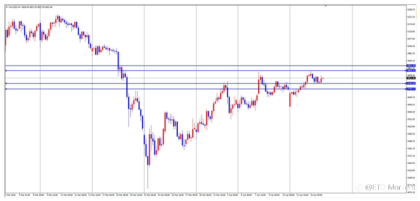 XAU / USD 昨日回顾与 ETO Markets 观点 周四,黄金整体呈现冲高回落后的震荡整理走势,亚盘高开后快速上行至 4838 附近受阻,随后进入横盘整理,美盘阶段转弱下探至 4772 附近后企稳,日线收出上影线偏长的阴线,全天波动约 657 点。驱动层面来看,停火协议短暂缓解避险需求,但霍尔木兹海峡风险与全球央行持续购金形成中期支撑,使价格未出现单边趋势,整体维持高位震荡结构。短周期上多次冲高未能有效突破,叠加动能分歧,显示行情进入区间整理阶段。 关键点位与操作建议 日内重点关注:上方阻力关注 4900 与 4870 附近;下方支撑关注 4750 与 4700 附近。 日内操作建议