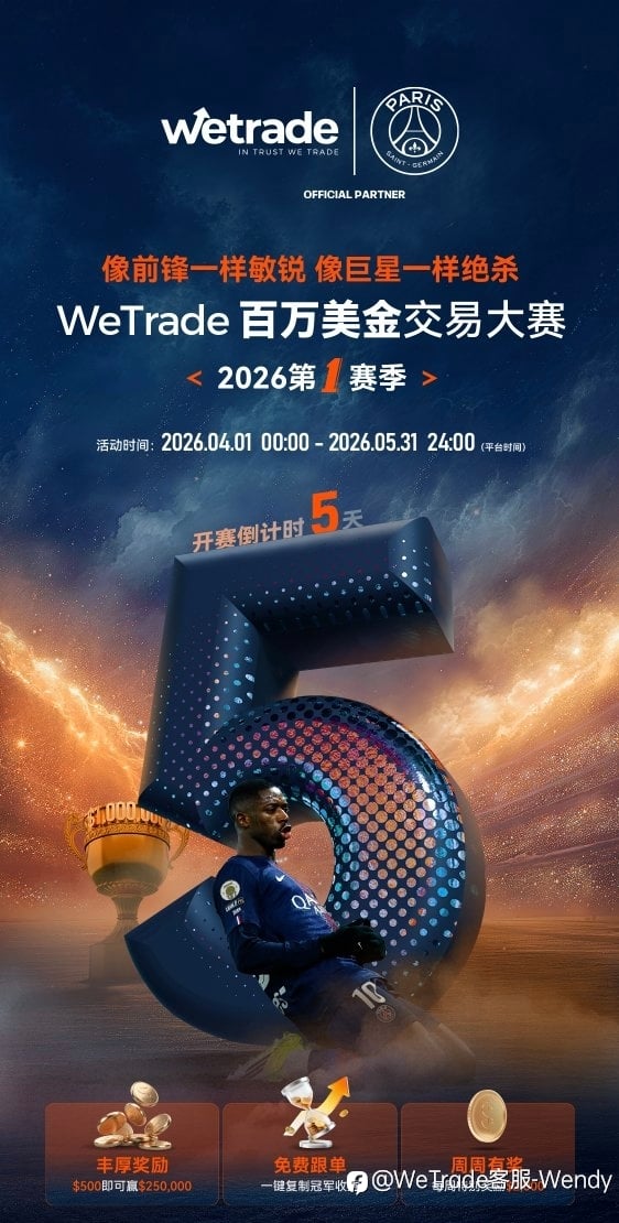 🔥 2026模拟交易大赛 · 第三赛季重磅来袭! 这一次,不止是交易对决,更是荣耀之战 🏆 冠军独享 $5000 美金大奖 👕 还有 PSG 限量版球衣 等您赢取 无需真实资金,用实力冲榜单! 📅 比赛时间:2026年03月01日 00:00 – 03月31日 24:00(平台时间) 点击立即参与 当市场节奏加速,真正的胜负,从来不只诞生于瞬间。它属于那些敢判断、敢执行、也敢坚守的人。 在全球金融市场波动再起之际,WeTrade 2026 模拟交易大赛第二赛季已于2026年2月28日圆满收官,第三赛季即刻接力登场。WeTrade 携手巴黎圣日耳曼,持续打造属于全球交易者的“金融绿茵场”
