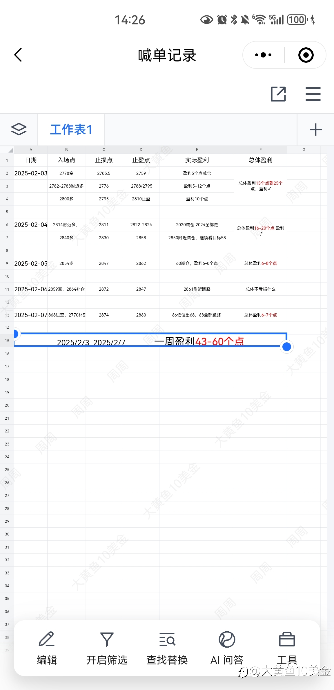 这周✓,大黄鱼平均10美金,已完成,知足常乐