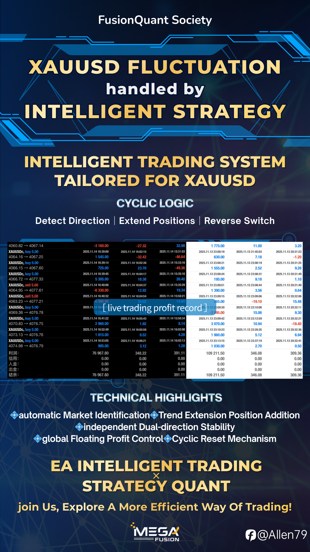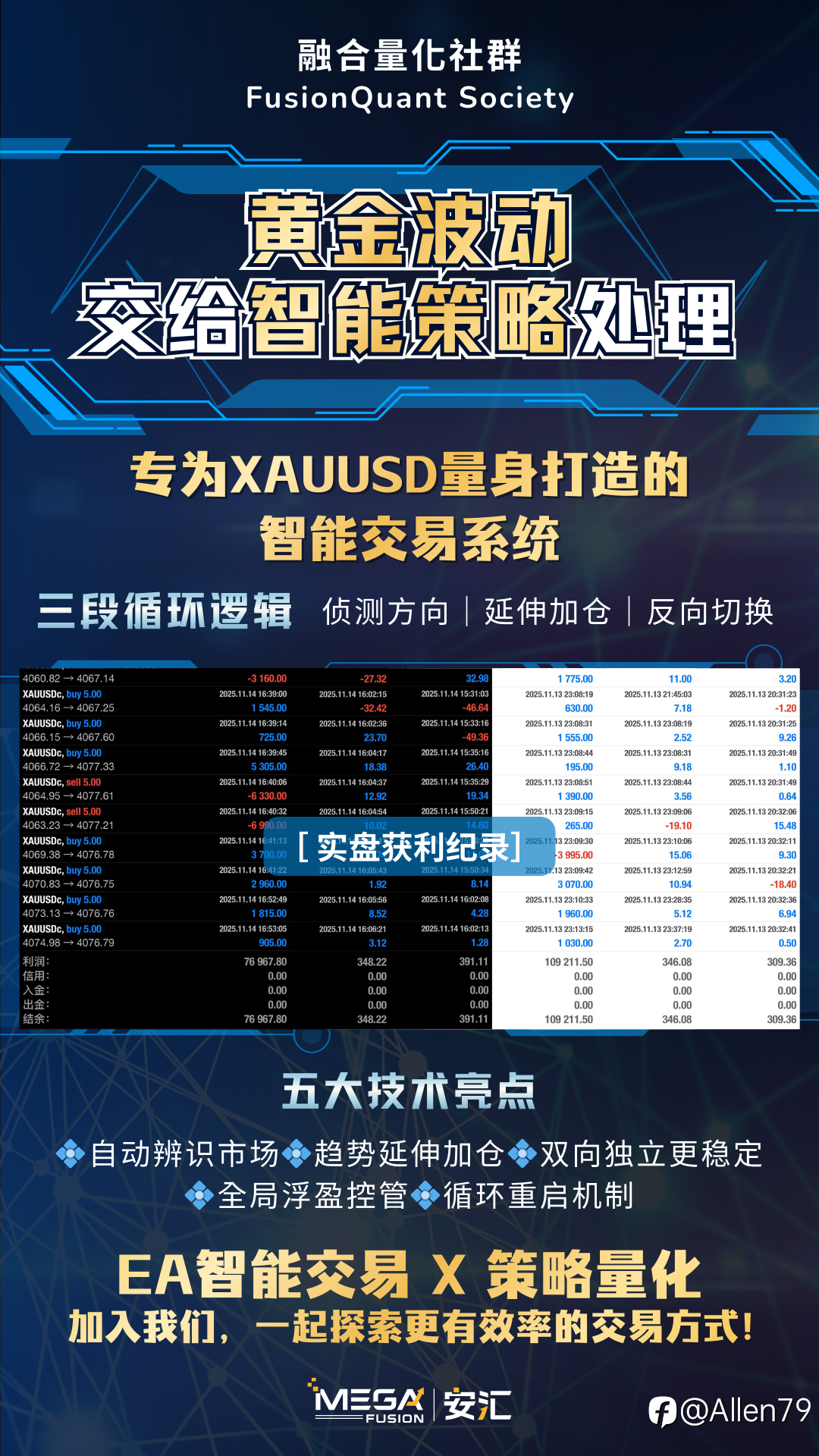在黄金长期高波动的市场环境中, 传统手动交易往往容易受到情绪、假突破、快速反转等因素影响, 导致决策延迟、加仓失控、风险暴露过大。 为此,我们打造了 FusionQuant XAUUSD 专用智能交易系统, 并在 MEGA Fusio...