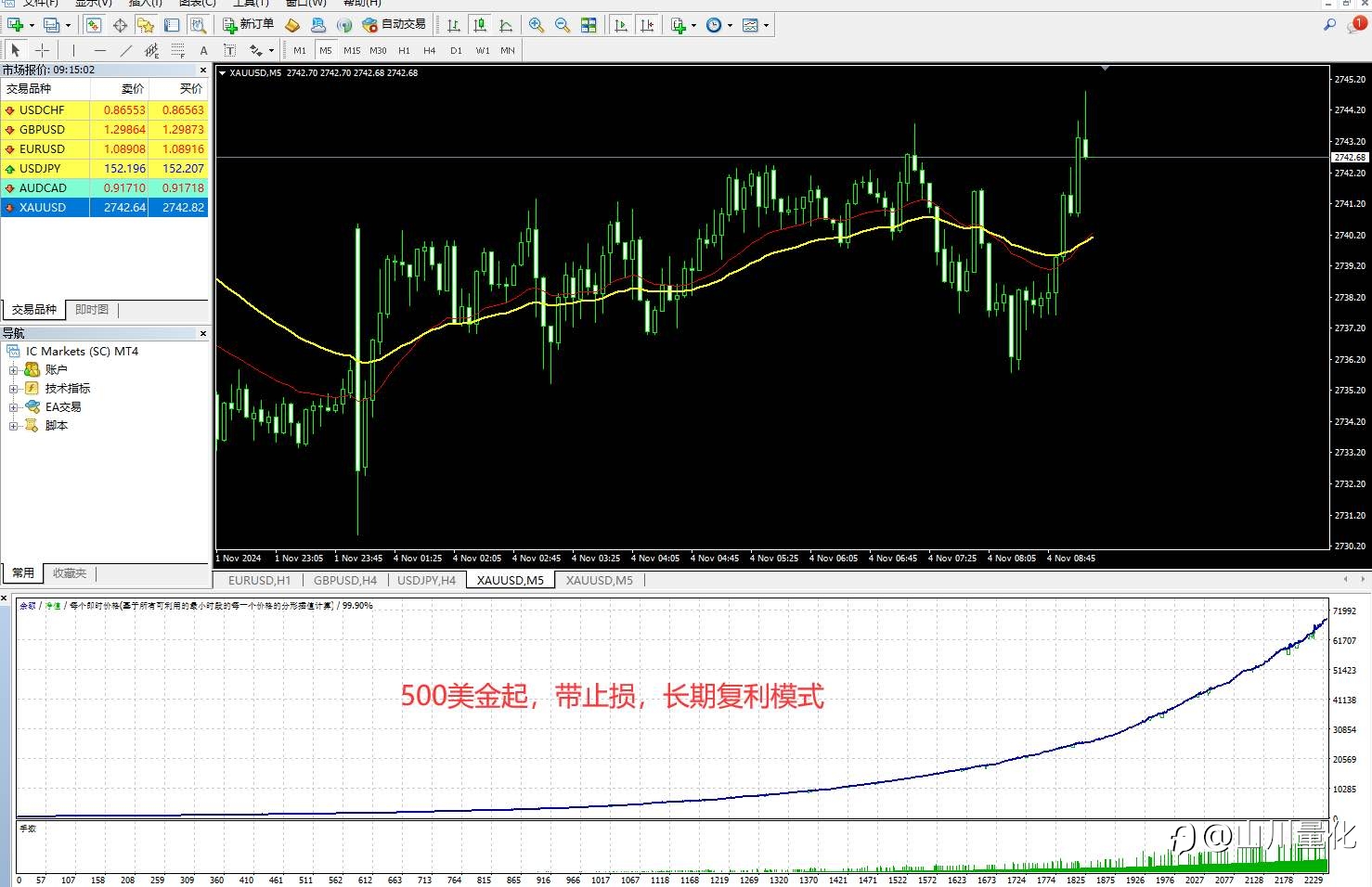 站在巨人的肩膀上!这是本人在著名EA东北路的基础上进行的优化升级版本,回测经过了近10年的各种行情历史,实盘已经开始按照复利模式长期进行,欢迎大家关注。目前实盘数据如下:实盘5个月,最大浮亏8.8%,最大净值...